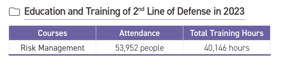 In order to improve the Group’s risk management, establish a climate governance culture, enhance the Group’s directors, supervisors and senior managers’ awareness of risks and the latest international development trends and concept changes, risk management courses are arranged every year. In 2023,a training session on "Natural Solutions and New Business Models for Enterprises to Move towards Net Zero" was held for the Group’s directors and senior managers, with a total of 40 participants. In addition, in order to enhance employees’ risk awareness, strengthen their awareness of laws and regulations related to AML/CFT, and enhance their information security protection capabilities and awareness, in order to establish an overall risk management culture, and effectively implement the Group’s risk management policies, we encourage employees to participate in various internal and external risk management-related education and training. Not only physical courses, but also digital technology is used to hold online education and training. On the other hand, the latest risk management regulations, trends or practices are also communicated to facilitate internal educational training use.