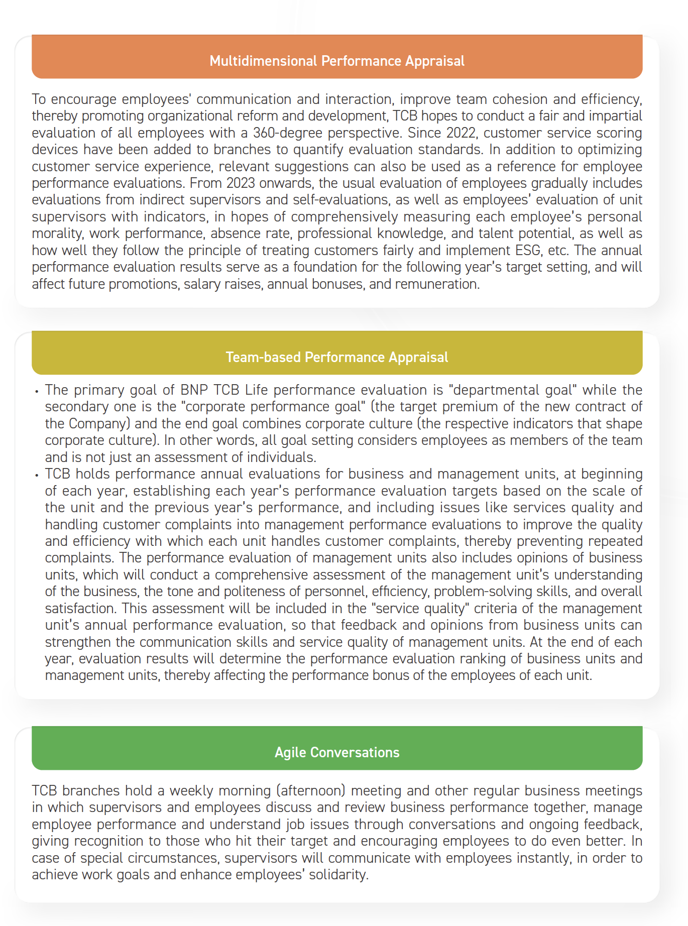 To inspire employees to unleash their potential and reinforce the organization’s operational efficiency, the Group has set up a fair evaluation and rewarding system, organizing both regular and irregular performance evaluations according to different duty natures. The performance evaluation results are then taken as a reference for future improvement, reward, or punishment. In recent years, the performance assessment system was gradually combined with the SDGs strengthening the Group’s sustainable governance. In 2023, 102.94% of employees in managerial roles and 96.25% of employees in non-managerial roles had gone through performance evaluation (the number of employees evaluated at TCB includes retirees, so the number at the end of the year is lower than the actual number of employees evaluated).