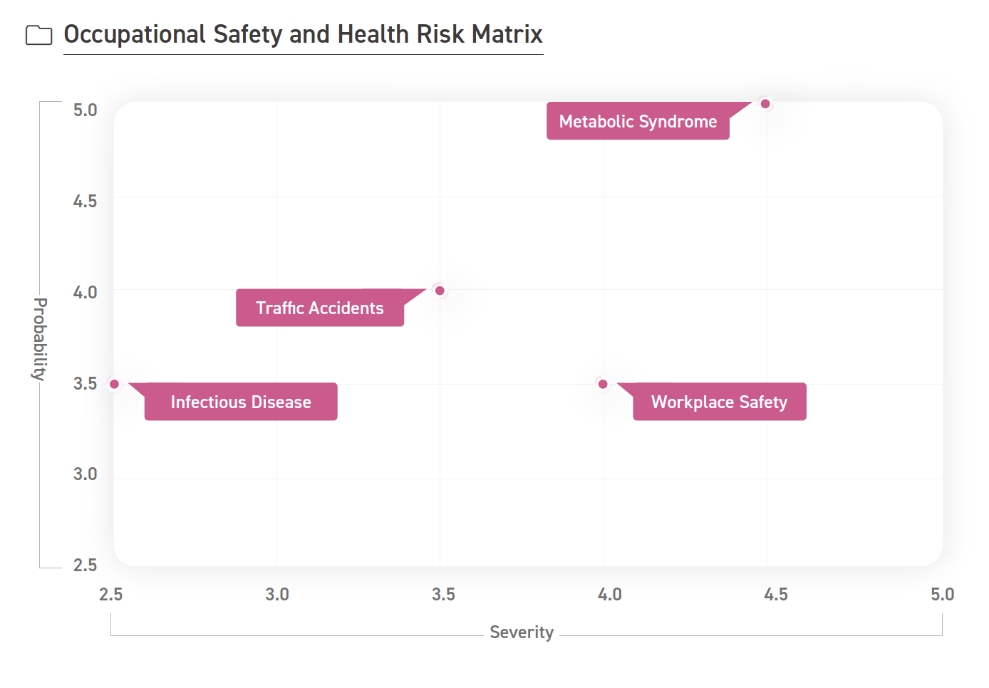 Based on the 2023 health risk assessment, 4 issues with medium to high incidence/impact levels were listed as health risks that need to be managed, among which metabolic syndrome, traffic accidents, infectious diseases and workplace safety were risk factors. TCB organized weight loss activities and 150 health promotion tours for those with high risk levels to effectively reduce the frequency of employee health hazards and improve organizational effectiveness.