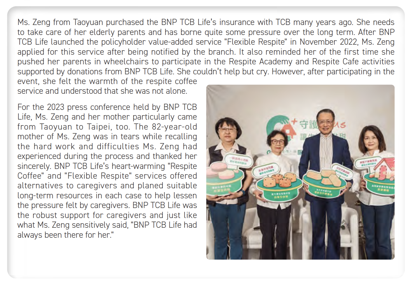 Since their launch in 2016, the "Caregiver Cafe" and the "Community Information Station" have provided more than 3,000 freecups of "respite coffee" as well as long term care advice and stress relieving activities to provide family caregivers a break from the stress of caregiving. Meanwhile, BNP TCB Life was the first to offer a value-added policyholder service that provided 10 cups of Respite Coffee every year to customers who made claims and needed long term care.