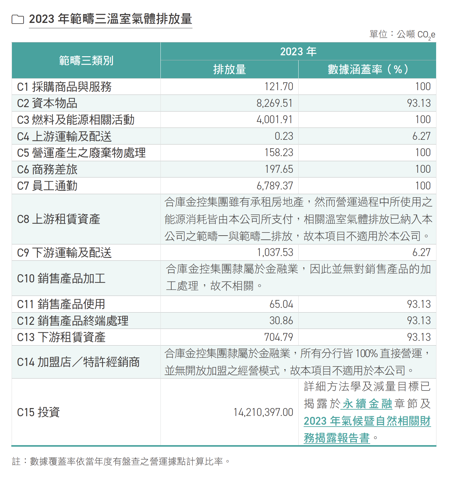 配合政府 2050 淨零排放,推動能源轉型政策,合庫銀行 11 處據點已完成設置太陽能板發電系統,實際總發電量達 260,082 度,減少的碳排放量約 128.74 公噸 CO 2 e,相當於 0.33 座大安森林公園的年吸碳量,另 5 處據點太陽能板發電系統建置中,累積共 16 處據點建置太陽能板發電系統,年發電量約達 50.34 萬度,同時採購2,446.47 萬度再生能源,合計可減少的碳排放量約 12,359 公噸 CO 2 e,相當於 31.98座大安森林公園的年吸碳量,2023 年綠電已轉供計 224.47 萬度,且已取得 2,250 張再生能源憑證,未來將響應國家淨零排放政策,逐步提高再生能源使用比重。