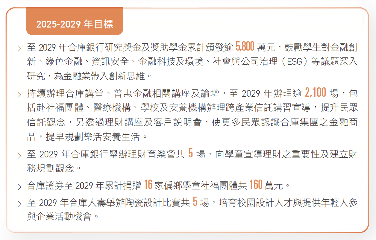 合庫深知教育與人才培育對企業和社會永續發展的重要性,多年來持續與社區、學校及機關密切合作,透過支持教育和學術研究,盡力讓每個孩子都享有同等教育與社會資源,並落實普惠金融,向不同階層推廣金融知識與理財觀念。