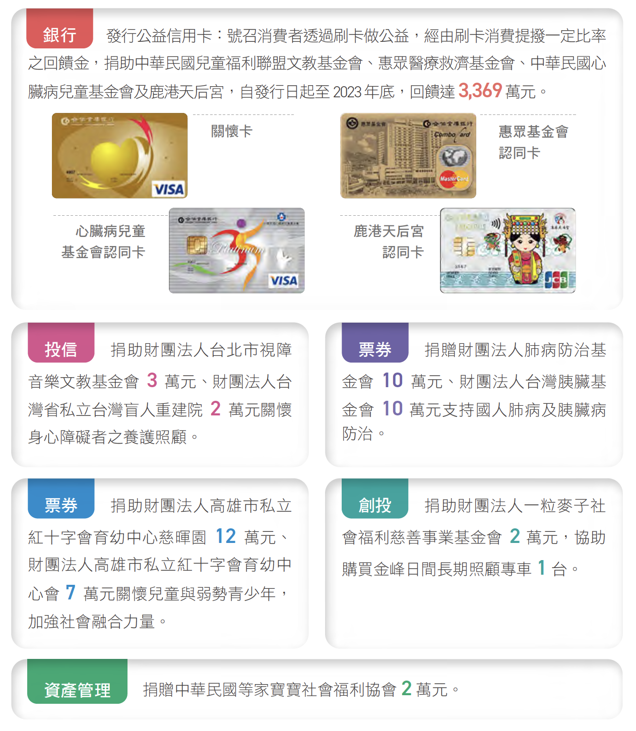 合庫除了善用金融核心職能與影響力,發展多元金融商品服務廣大客群外,更秉持「取之於社會、用之於社會」的精神,結合集團力量,持續傳遞溫暖、支持公益團體及支援急難救助。