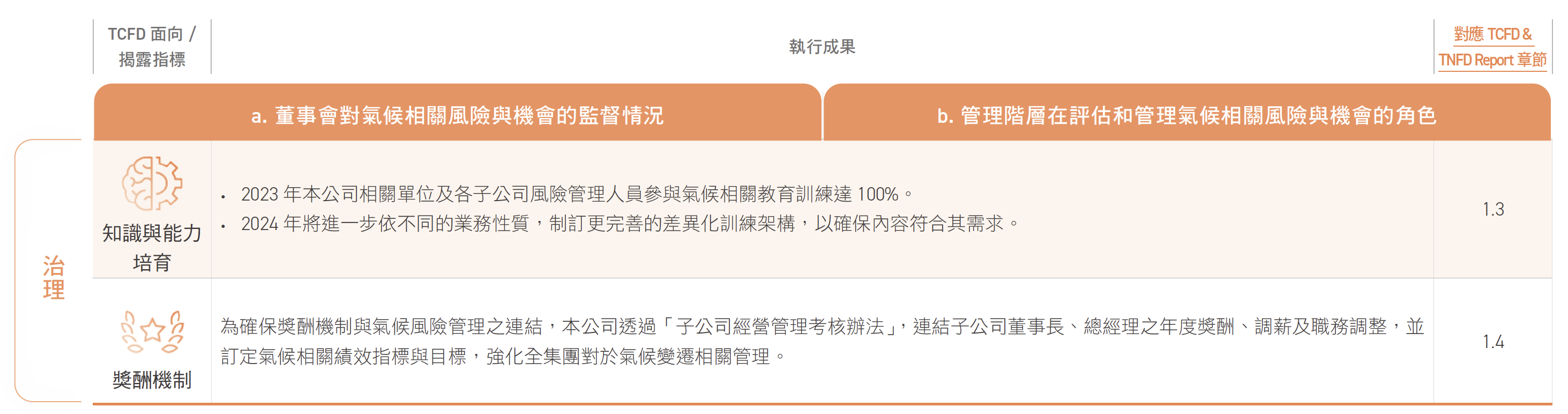氣候變遷已成為全球不可忽視的議題,金融業作為資本市場重要的角色,更應成為氣候變遷管理的領導者。本公司於 2020 年 12 月簽署成為 TCFD Supporter,並成立集團內跨子公司之 TCFD 工作小組,依照 TCFD 之「治理」、「策略」、「風險管理」及「指標與目標」架構,透過教育訓練及工作小組會議,逐步建構本集團氣候相關風險與機會之辨識、衡量、監控及報告等管理程序。
